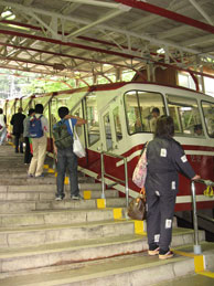 ケーブルカー、右が高尾山のケーブルカー。勾配は高尾山のほうが急だそうです |