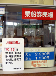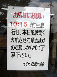 早朝4時半に東京を出発し、午前10時少し前に「びわ湖汽船」の乗り場に着いてみれば、待っていたのはフェリーの欠航を無情に告げる1枚の案内板だったではありませんか。 |