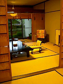 (左)次の間と庭が付いたゆっくりした造りのお部屋 (右)露天風呂の付いた浴場 |