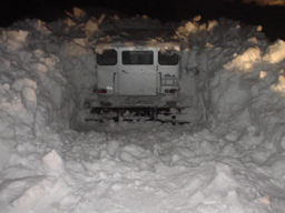 そんな経緯があったので、今回はまず雪に埋まった雪上車を掘り出すという、あまりにもナンセンスな作業のために、恐ろしくタイヘンな手間がかかってしまいました。 |