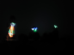下の写真をご覧になって頂ければお分かりのとおり、日比野さんが身に着けていらっしゃるLEDネクタイと私の頭の上に立っているLED一本角は、まあ地味ですが、黒川先生のLEDトンボ眼鏡はかなり目立ってました。