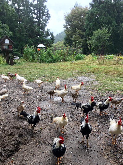 台風が去った翌朝、小屋から庭へ出たニワトリたち。