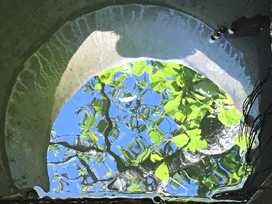 空と周囲の梢(こずえ)が水面に写って、まるで鏡のよう。