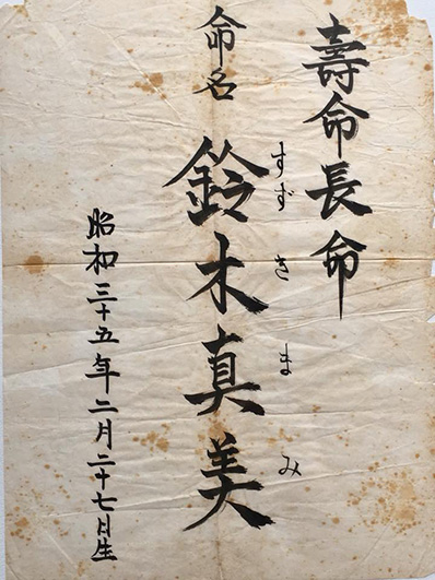 私が産まれた時に伯父がしたためてくれた命名書。