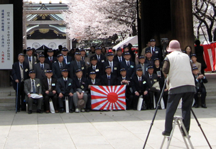 桜が満開の神社境内を歩いていると、今まさに記念撮影をしようとする元軍人さんの一行に遭遇しました。 |