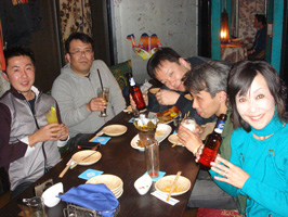 台湾から一時帰国中の阿部新助さん(左端)を囲んでの新年会@アラビアンロック渋谷店 |