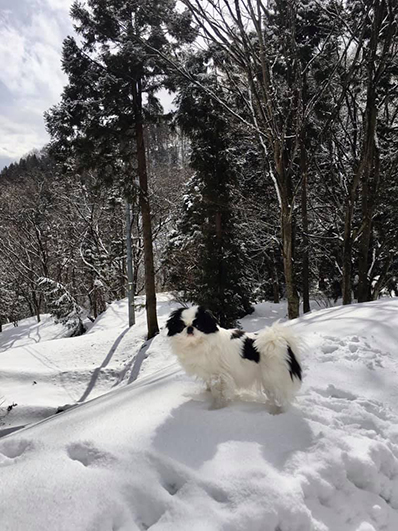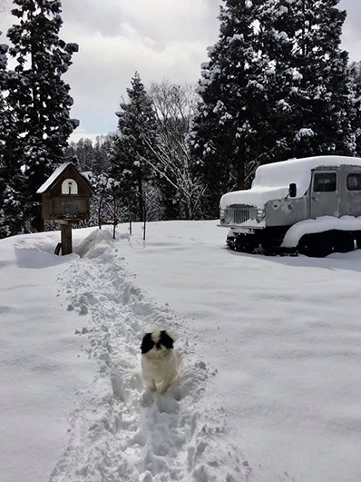 1週間ほど前から突如として野生に目覚め、朝から庭に飛び出して雪の中を転げ回って遊ぶようになったじゃありませんか。いくら「帰ろう」と言っても聞きません。 |