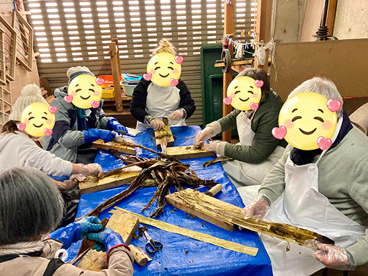 その言葉に嘘偽りはなく、今回の紙漉き体験も、あらかじめ用意された材料を組み合わせてチャチャッとハガキを1枚漉いて終わり……ではなく、和紙の原料となるコウゾの木の皮を剥いだり黒皮を取ったりと、なかなかハードな工程を体験して行かれました。