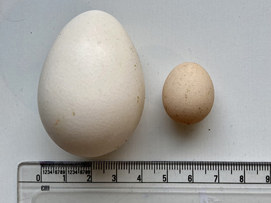 ……通常の鶏卵(↑写真左)よりはるかに小さい、誰のものだかわからない卵(↑写真右)が、転がっていたではありませんか。