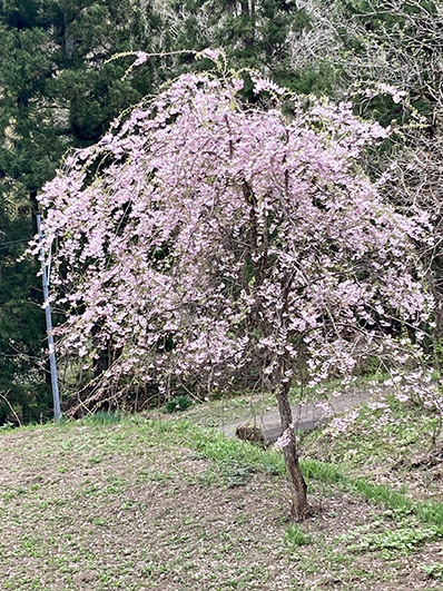 しだれ桜を母屋のベランダから見下ろしたところ。